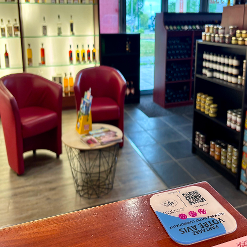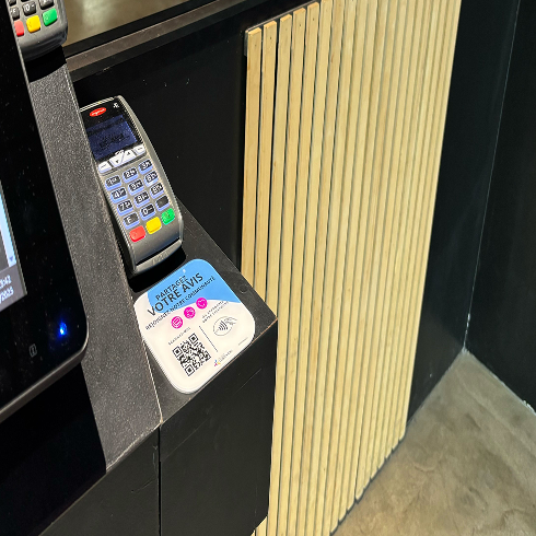 C’est l’endroit le plus naturel : vos clients viennent de payer, ils sont satisfaits de leur achat et disponibles pour partager leur expérience. La plaque posée juste à côté du terminal de paiement ou du sac de courses attire leur regard et déclenche le geste.