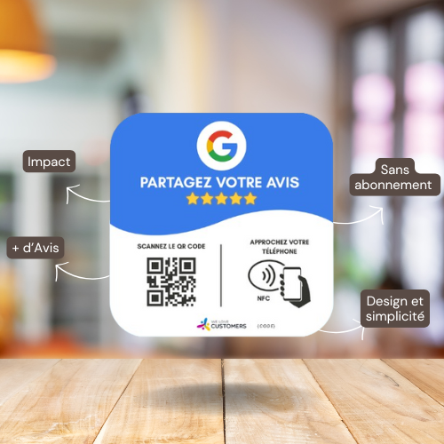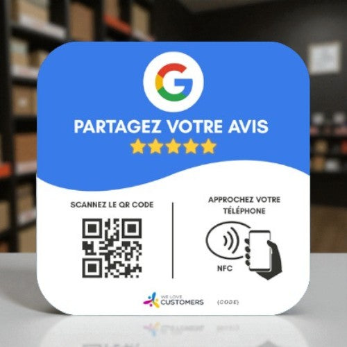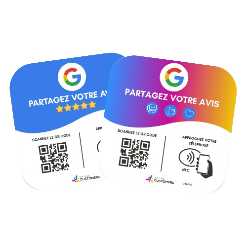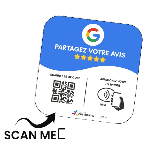 Elle combine QR Code et puce NFC. Vos clients n’ont qu’à scanner ou approcher leur téléphone pour être redirigés automatiquement vers la page d’avis que vous avez configurée.